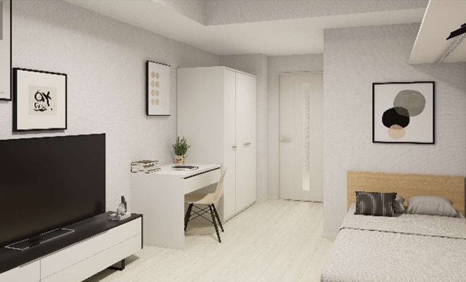 ワンルームタイプの部屋は机やキッチン、収納ベッド、ユニットバスなどがあり、食堂などの共有スペースも充実しています。
